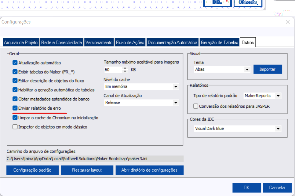 Com esta funcionalidade ativa, toda vez que um erro inesperado ocorrer, clique na opção Enviar Relatório de Erros” e o Maker automaticamente criará um arquivo com extensão .ZIP na pasta C:\Documents and Settings\<nome do usuário>\Configurações locais\Dados de aplicativos\Softwell Solutions\Maker Studio Bootstrap.