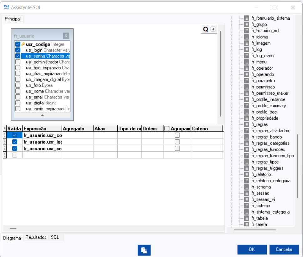 Pela tela Assistente SQL, será criada a consulta que comporá o formulário. Caso tenha sido selecionada mais de uma entidade na área do Assistente SQL, os dados que serão informados no formulário, quando utilizados no Webrun só poderão ser gravados na primeira entidade selecionada.