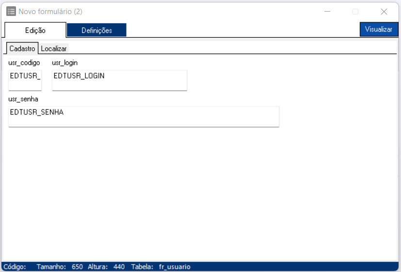 O formulário será criado com duas abas: a primeira, por padrão, é chamada Cadastro, e a segunda é chamada Localizar (Para maiores explicações, ver item Definição de Formulários).