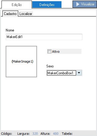 Com o formulário aberto, é hora de adicionar componentes ao mesmo. Primeiro, adicione um componente Caixa de texto e na propriedade Descrição, determine "Nome", em seguida um componente Check e na propriedade Descrição determine "Ativo", adicione um componente Imagem e por fim adicione um componente Lista e na propriedade Lista determine "M" para Masculino e "F" para Feminino. O formulário ficará da seguinte forma: