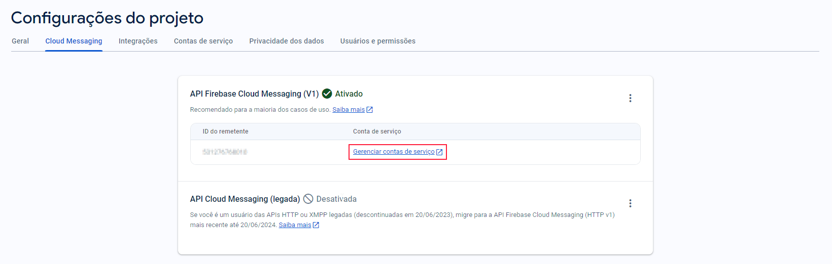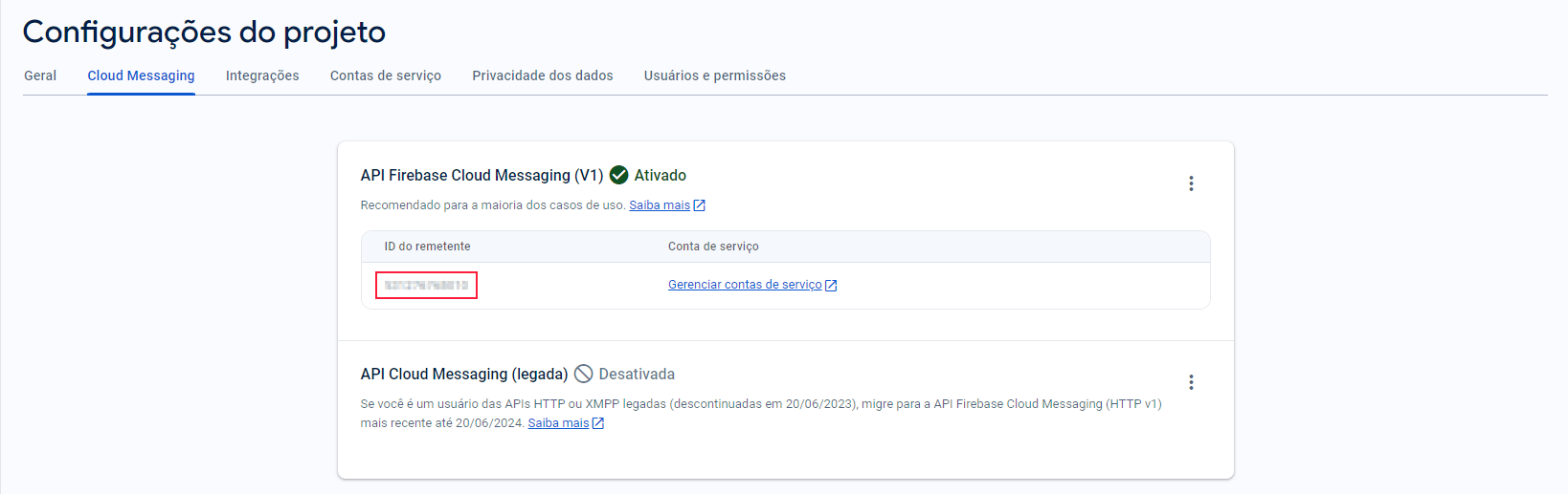 Ao abrir as configurações, clique em Cloud Messaging e copie o código do remetente: