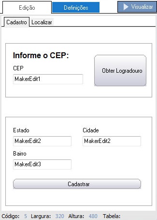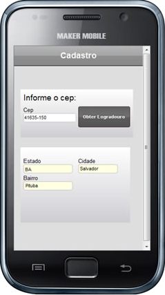 Este exemplo tem por finalidade demonstrar a utilização do WebService no Maker Mobile. Primeiramente imagine que seja necessário preencher um formulário de cadastro e que neste formulário seja necessário informar o CEP para consulta do Estado, Bairro e Cidade. Com base nesta linha de raciocínio, siga os passos abaixo.