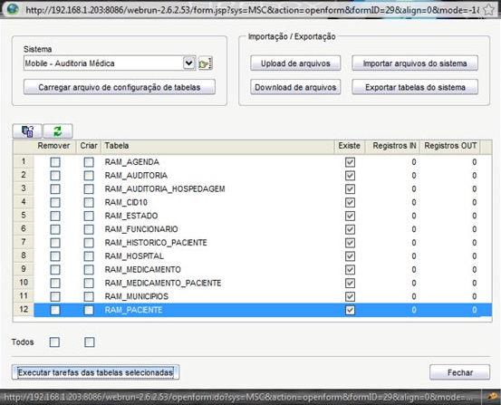 Existem dois campos check nesta grade, Remover e Criar. Os mesmos servem para remover ou criar as tabelas na base do Manager. Selecione as tabelas que deseja sincronizar com a aplicação móvel e clique no botão Executar tarefas das tabelas selecionadas para criar as tabelas desejadas.