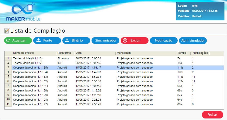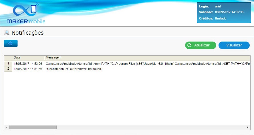 O Maker Mobile disponibiliza uma tela de notificações, onde cada problema na exportação do projeto será notifcado nesta tela.