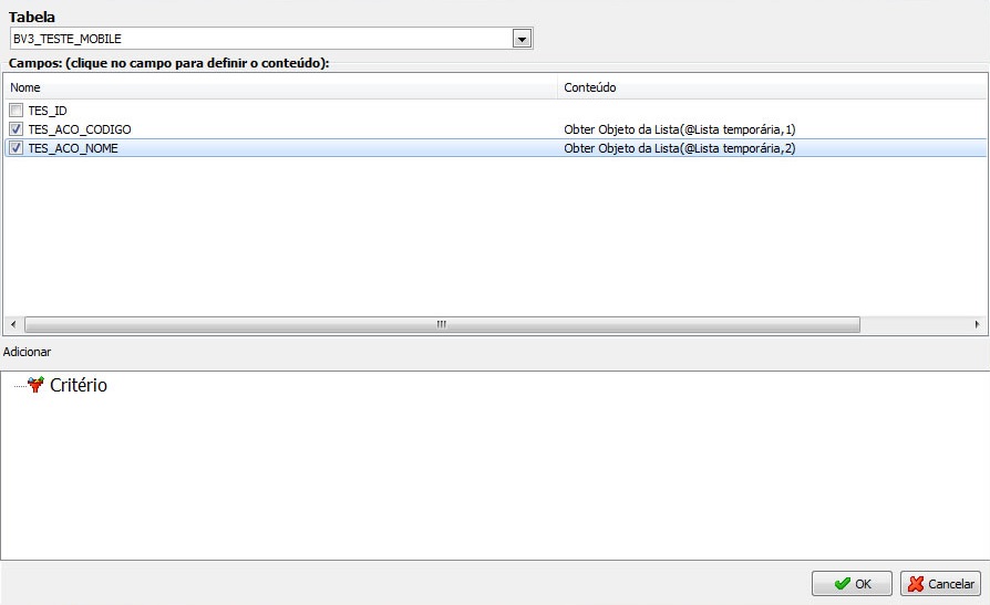 - Para o campo ‘aco_codigo’ informe a função Obter Objeto da Lista.