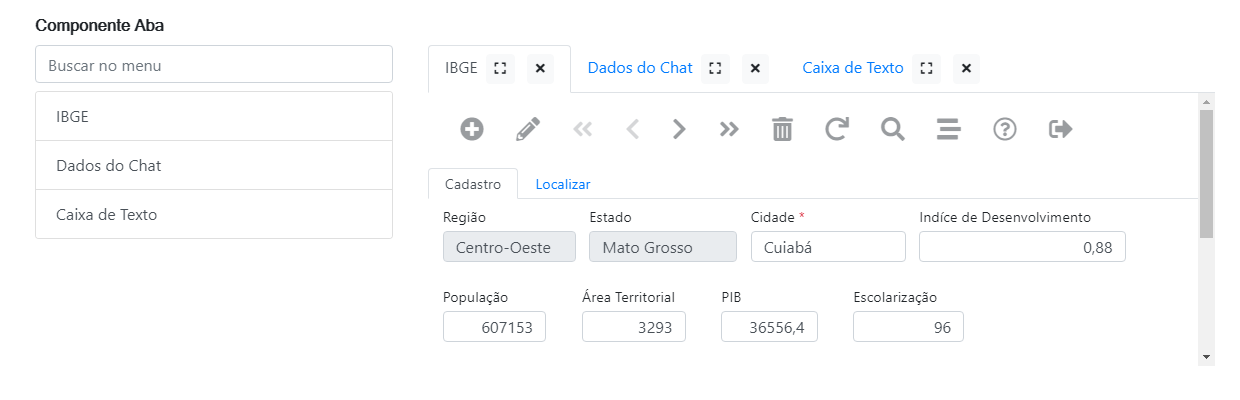 | Tabulação | Indica a ordem de tabulação do componente em relação aos outros que compõem a aba do formulário na qual está posto. Essa ordem pode ser observada quando o usuário altera o estado do formulário/grade para o modo de inclusão ou edição e navega entre os componentes/campos usando a tecla Tab. | Inteiro | 2 |