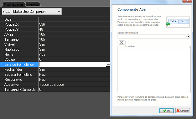 Nesta propriedade serão informados todos os formulários que serão representados por abas no formulário de trabalho. Para tal tarefa existe uma tela de escolha, que permite selecioná-los.
