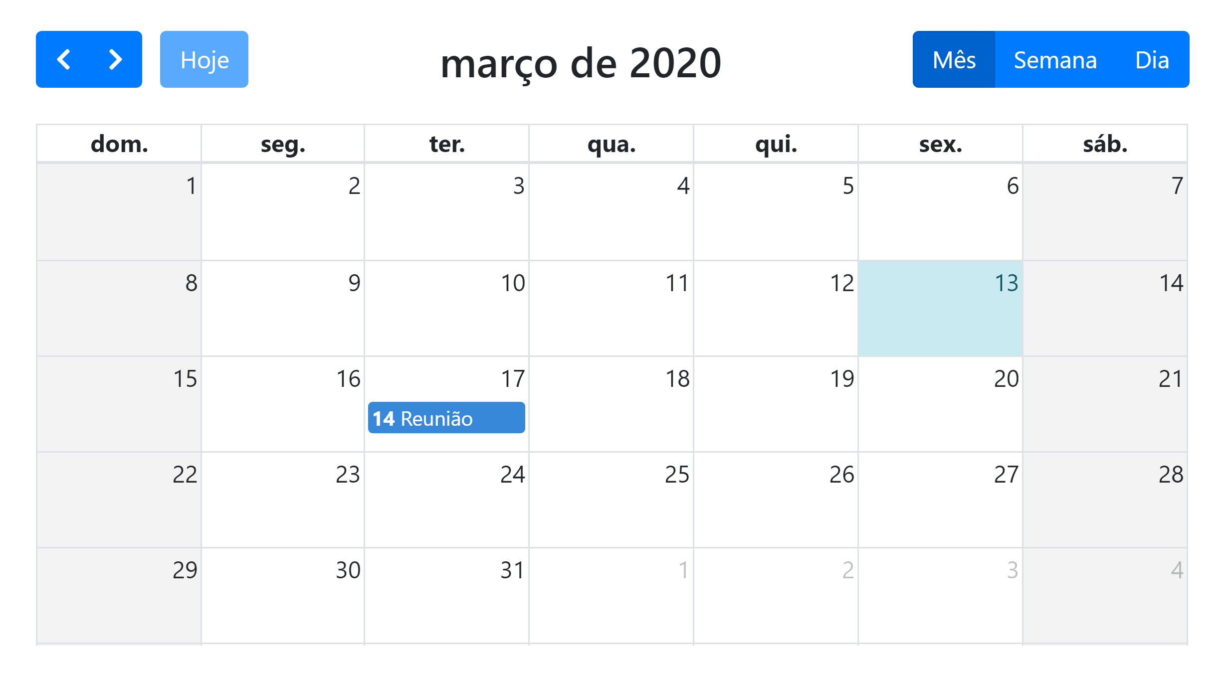 | Modo de Visualização | Define o modo de visualização do calendário. - Mês: Visualização padrão de um calendário, exibindo todos itens do mês. - Semana: Visualização dos dias da semana. - Dia: Visualização das horas do dia. OBS: O usuário poderá alterar a visualização pela barra de navegação do calendário, essa propriedade define qual vai ser o modo de visualização inicial. | Lista | Mês |