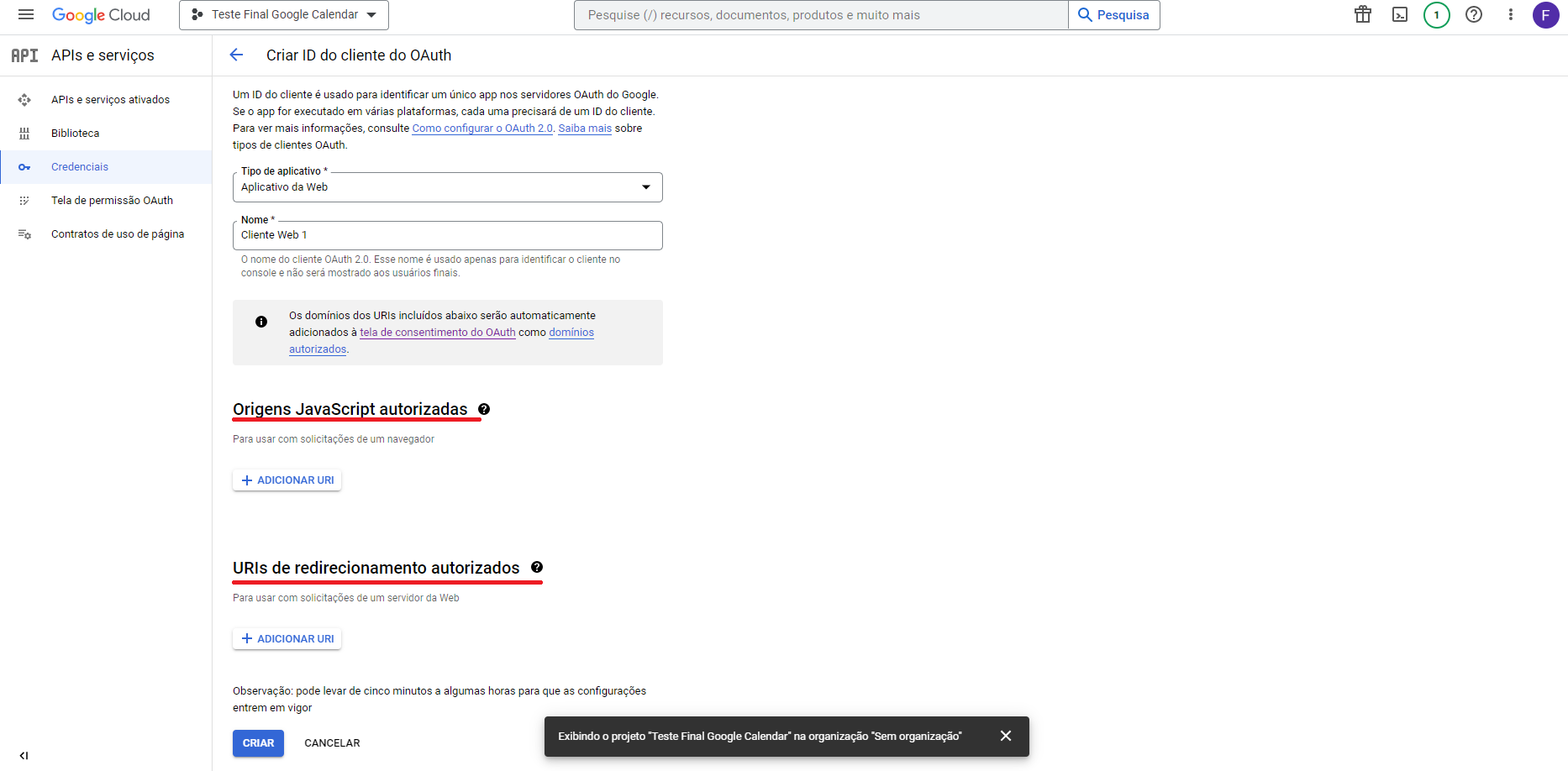 - Logo em seguida devemos criar um ID de Cliente OAuth, é fundamental que o tipo da aplicação seja Web. Após a criação do ID de Cliente OAuth devemos adicionar a URL do contexto da aplicação nas propriedades Origem JavaScript Autorizados e URIs de redirecionamento autorizados, exemplo: http://localhost:2020 ou https://softwell.com.br.