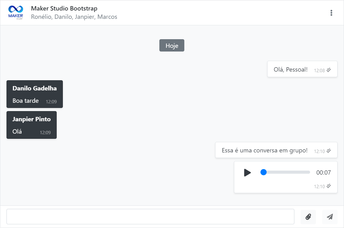 O componente Chat foi criado para ser utilizado na interação entre usuários. O componente utiliza Websocket para comunicação de envio e recebimento de mensagens.