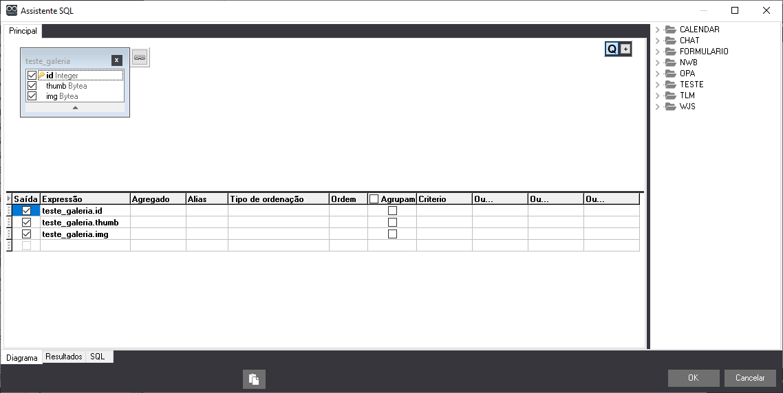 Após criar o componente, defina na propriedade SQL uma tabela e selecione os campos apresentados que serão atribuídos aos campos: ID, Miniatura e Imagem.