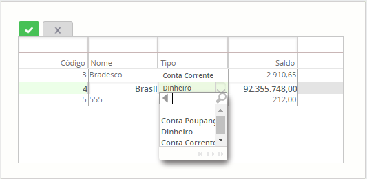 | Ativar Pesquisa | Propriedade que permite habilitar a pesquisa no componente. A pesquisa é realizada seguindo o padrão CONTENDO (LIKE) e é aplicada à coluna em questão. | Lógico | Sim |