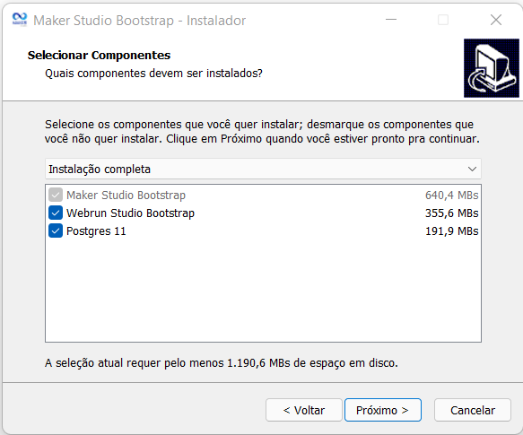 Cenário 3: Usando o instalador da nova versão do Maker/Webrun, você quer instalar apenas o Maker e o PostgreSQL e, em um segundo momento, instalar o Webrun (todos os SO’s):