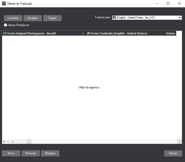 Idioma Referência - ativando esta opção, é habilitada a caixa de seleção Traduzir de (abaixo da caixa de seleção Traduzir para) e é criada uma nova coluna na grade da tela com a opção escolhida na caixa de seleção (considerar neste item a explicação para o botão Sugerir).
