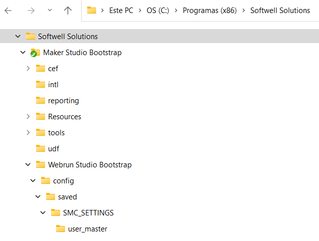 Deve-se observar que esses arquivos de configuração são criados para cada usuário. Caso ocorra uma mudança de servidor, por exemplo, para não perder as personalizações, devem-se copiar as pastas contidas em ...\SAVED. Na pasta C:\Arquivos de programas\Softwell Solutions\Maker Studio Bootstrap\Webrun Studio Bootstrap\config\saved, temos subpastas para os mesmos sistemas registrados no nível acima, contendo subpastas de usuários, armazenando arquivos *.XML das configurações dos atalhos criados, descritos nos arquivos shortcuts.json.