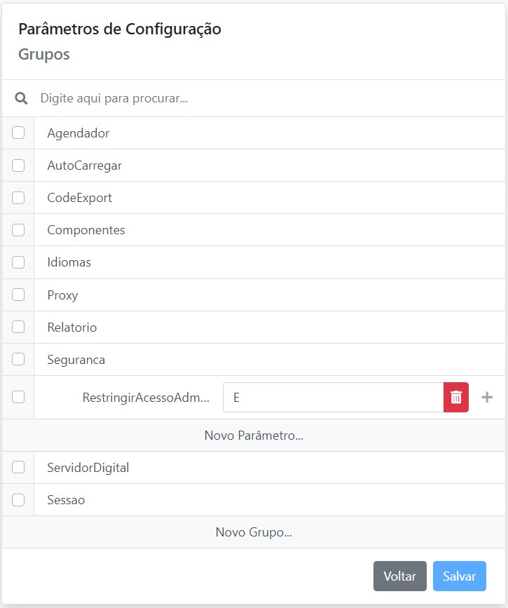 - Crie um novo parâmetro com o nome RestringirAcessoAdministrativo;
